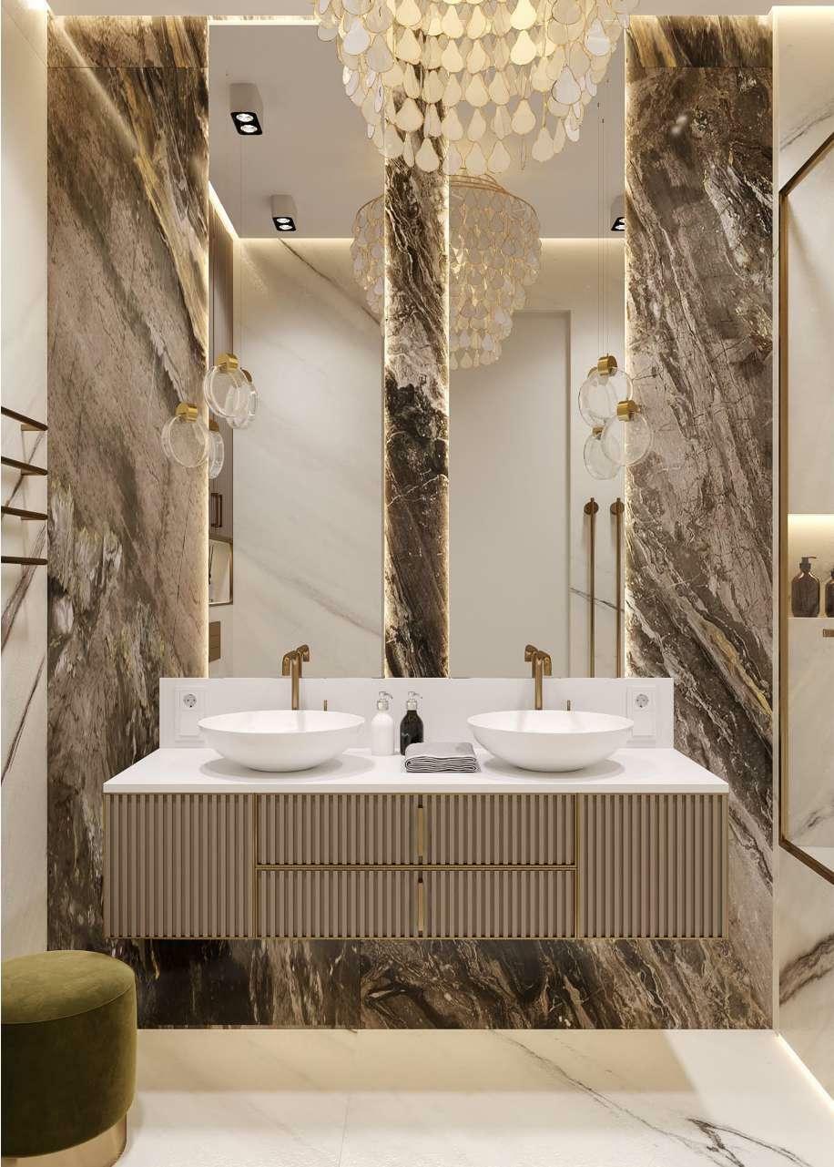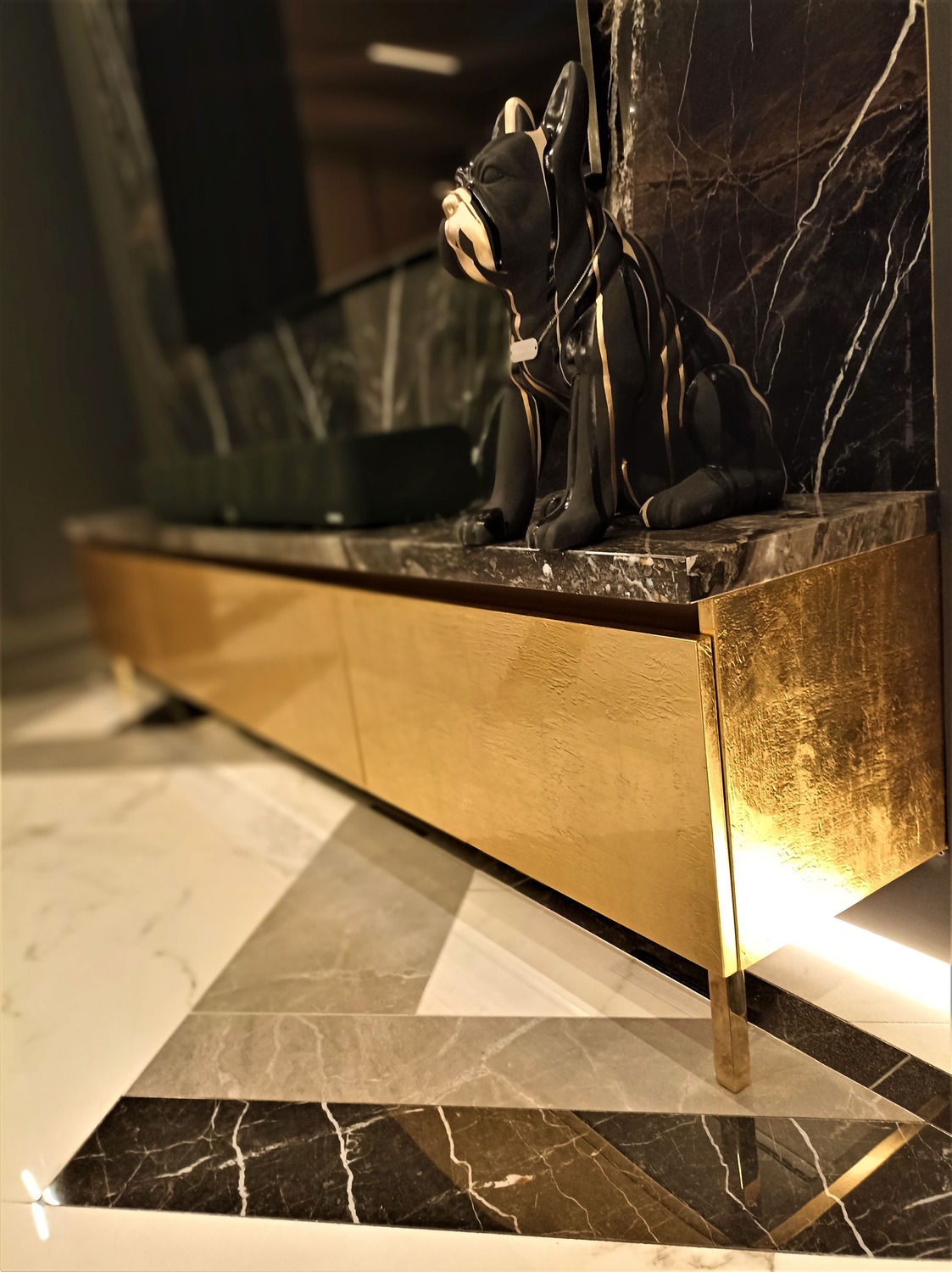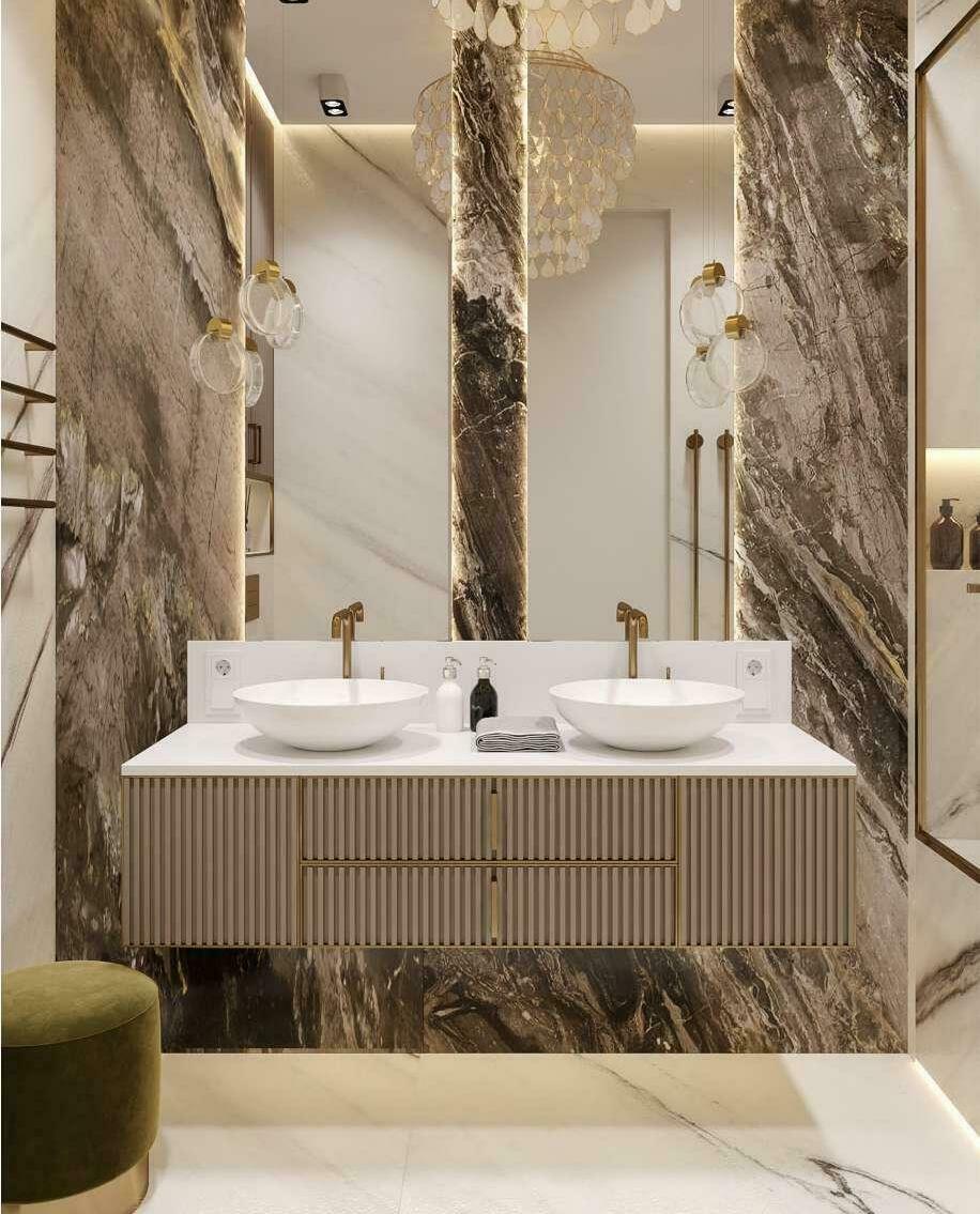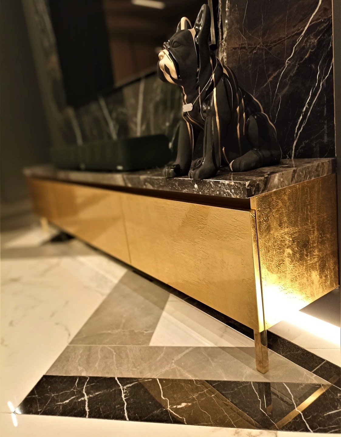 Мебель с использованием натурального камня идеально сочетается с металлами и деревом. Такая мебель красиво себя демонстрирует в ванных комнатах и позволяет грамотно обыграть