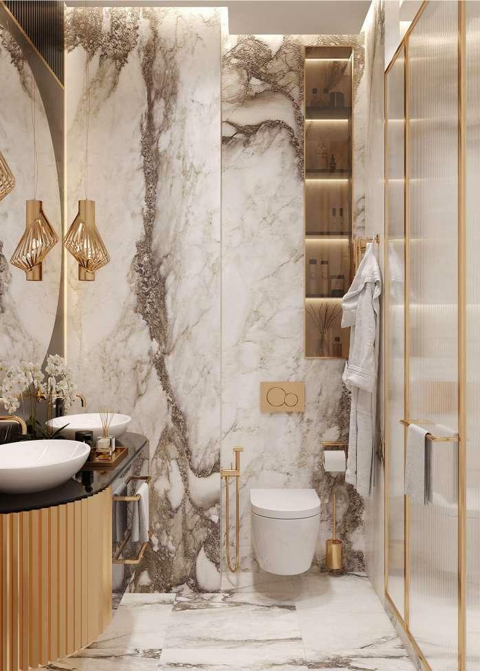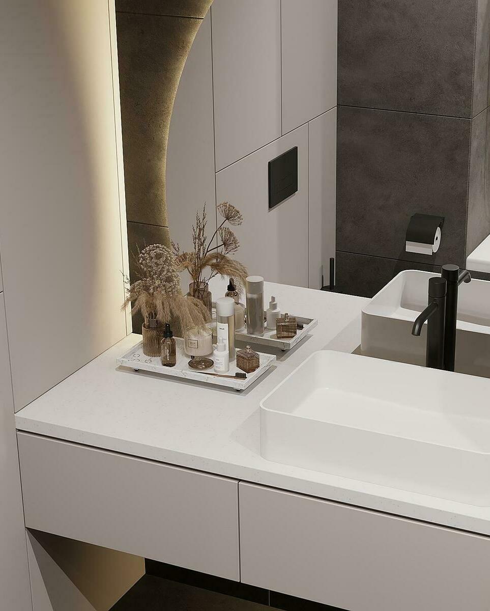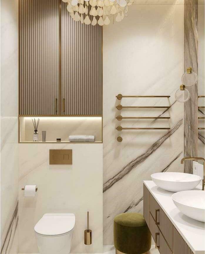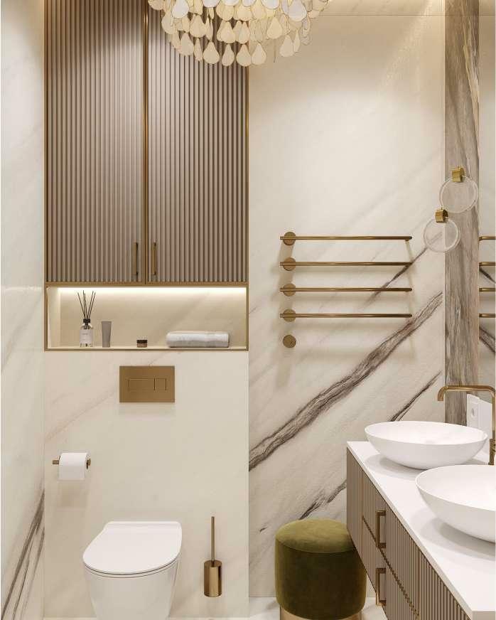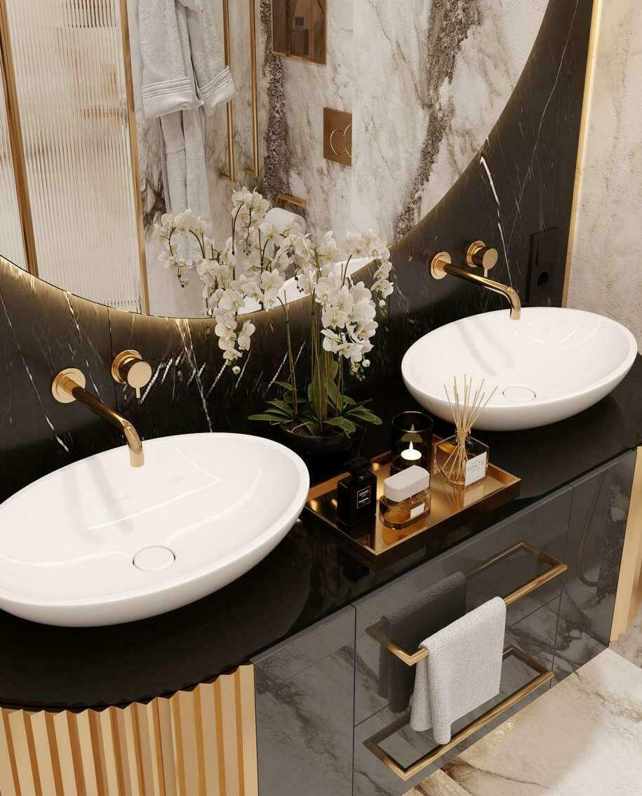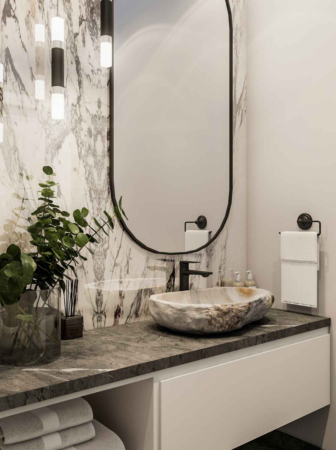 Мебель с использованием натурального камня идеально сочетается с металлами и деревом. Такая мебель красиво себя демонстрирует в ванных комнатах и позволяет грамотно обыграть